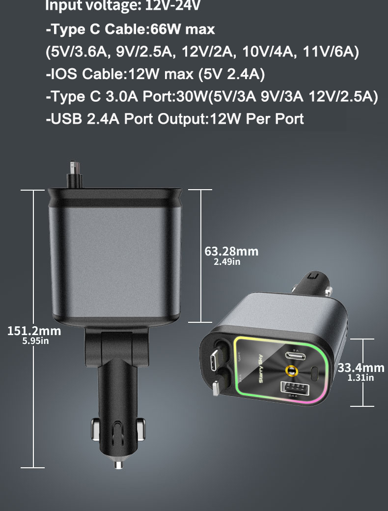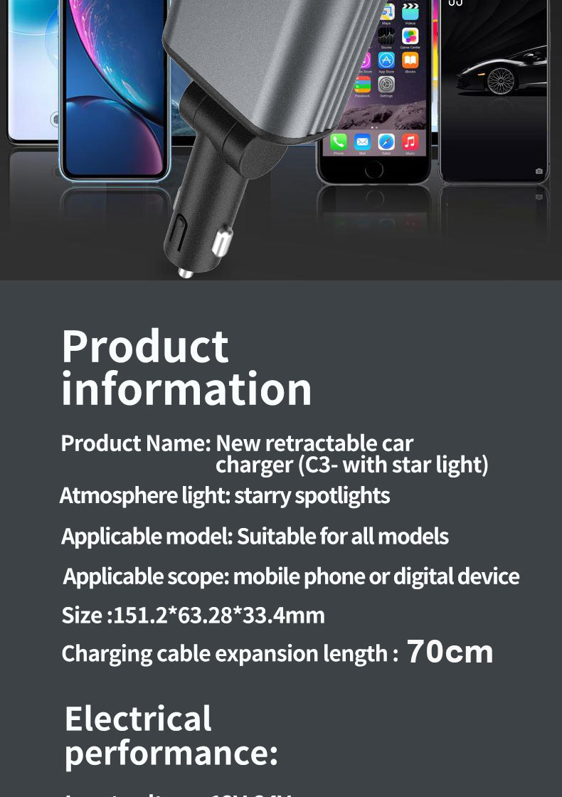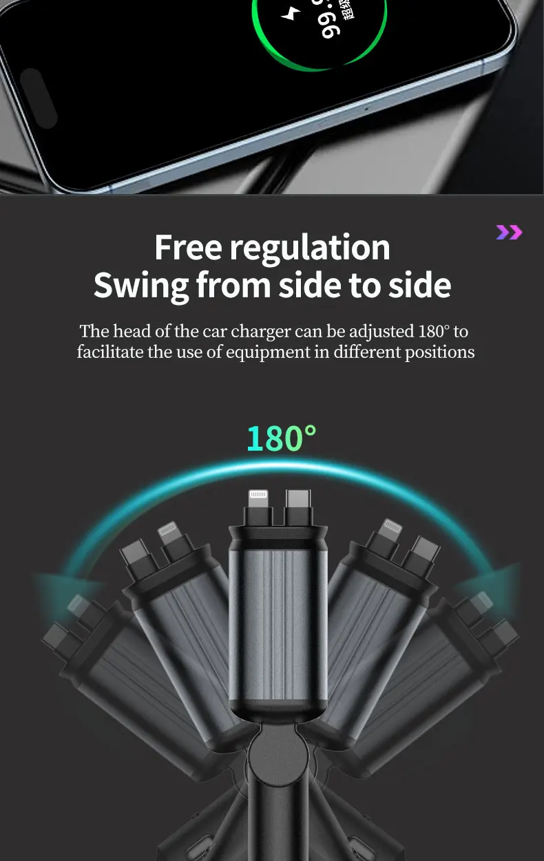 Tired of messy cables all over your car? This 4-in-1 retractable charger is the perfect solution to keep your vehicle organized and your devices always powered up.